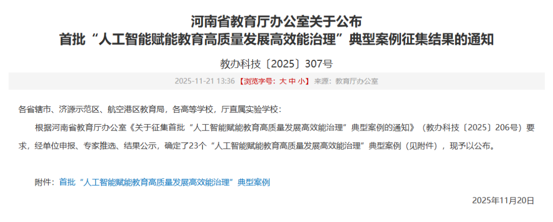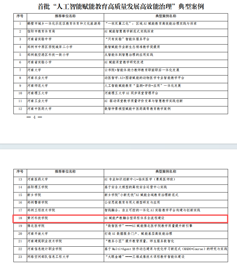 11月20日,河南省教育厅公布了首批“人工智能赋能教育高质量发展高效能治理”典型案例名单,全省共23个案例入选。我校申报的“AI赋能产教融合型课程体系全流程建设”案例成功入选。